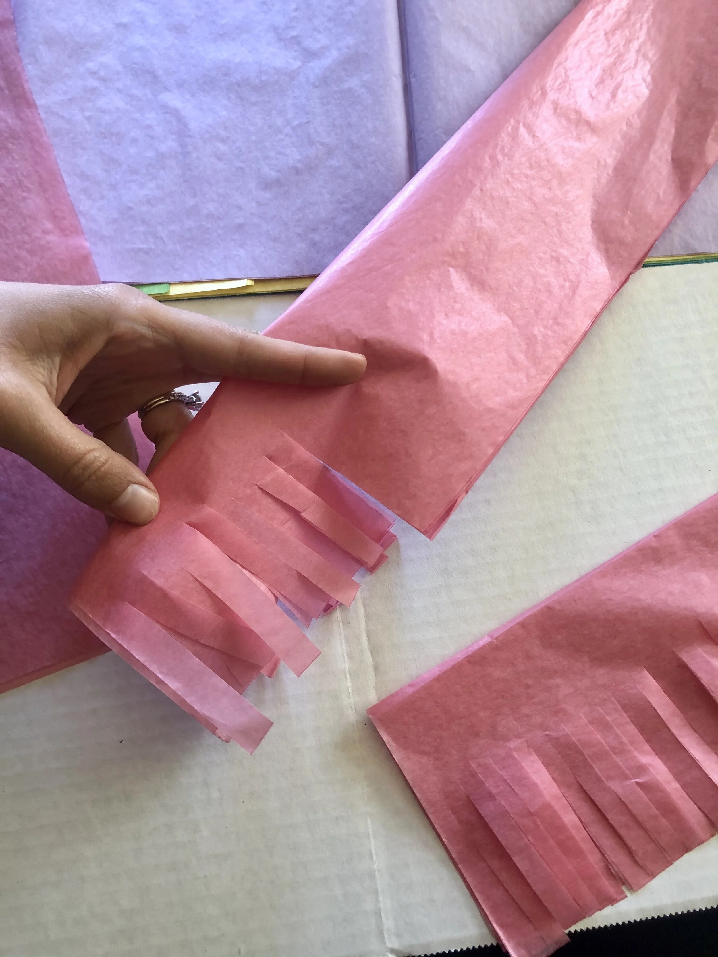 The nice thing about a fringe piñata look is that you really can’t mess it up too much! It’s forgiving and you can make it whatever you want! I started cutting cutting my tissue paper into pieces that were probably around 6 inches long and then folding hotdog style and cutting fringe strips opposite of the fold. (Look at the picture and it’ll make more sense!)